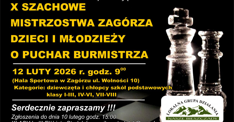 12 lutego 2026 r. w Hali Sportowej w Zagórzu odbyły się X Szachowe Mistrzostwa Zagórza Dzieci i Młodzieży o Puchar Burmistrza. Wydarzenie zostało zorganizowane przez Miejsko-Gminny Ośrodek Kultury i Sportu w Zagórzu, Zespół Szkolno-Przedszkolny w Zagórzu oraz przy współpracy Lokalnej Grupy Działania Nasze Bieszczady .